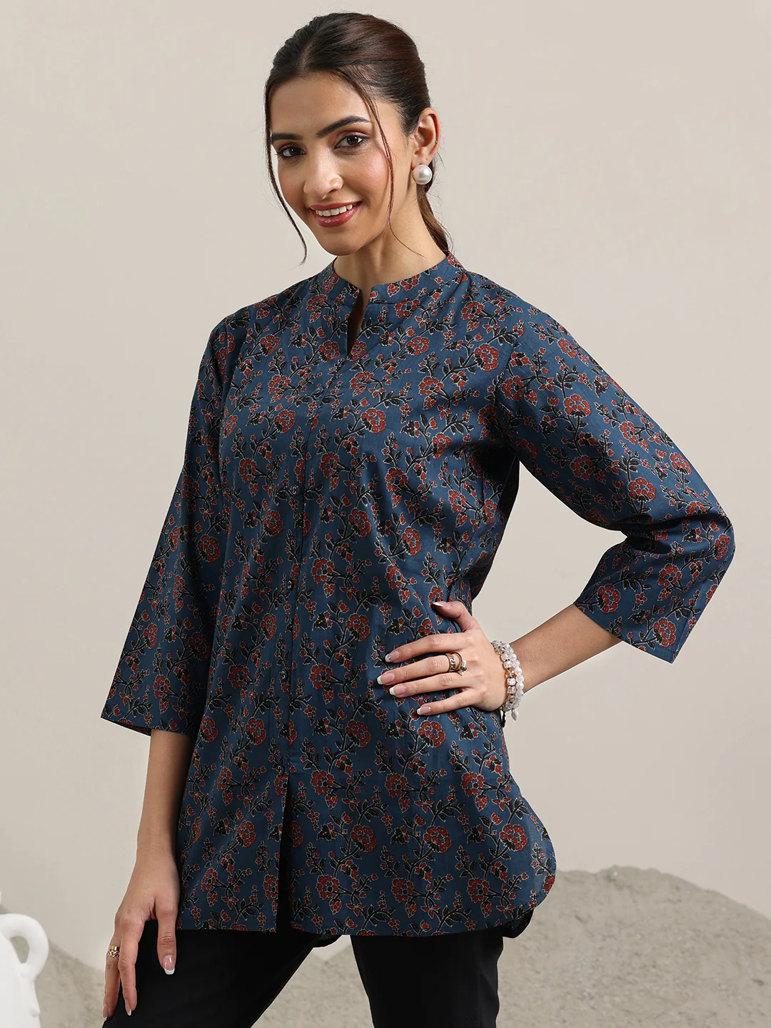 Blue Printed Cotton Straight Short Kurti