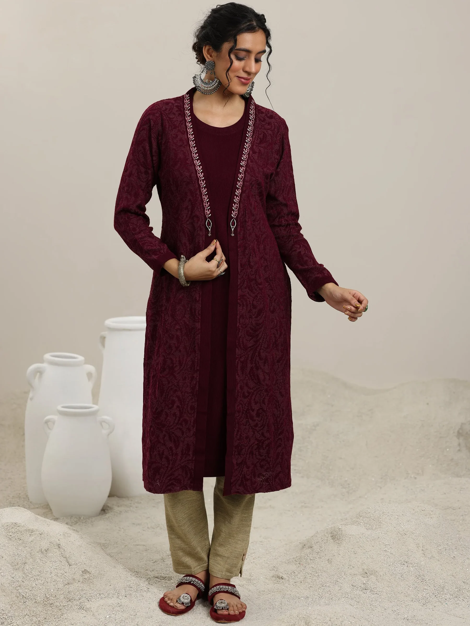 Maroon Solid Wool Straight Kurta